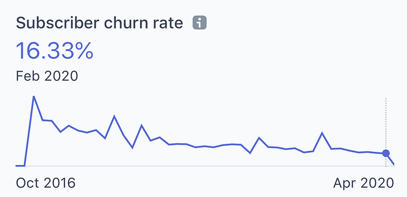 So, I can say my strategy focusing on pleasing the existing users instead of new/leaving users is valid. The growth is slow as you can see. It does not look sky-rocketing like a VC-backed startup but that’s the result I wanted — Stability. The subscriber churn rate of Inkdrop was 60-90% at the beginning, which was terrible, but it has been decreasing and now it’s at around 16%: