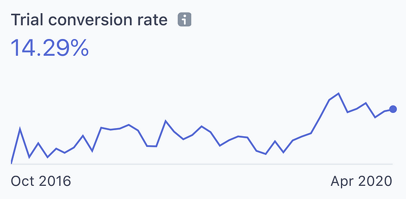 In general, churn rate in subscription B2B is at 5%. You may think the base churn rate is indicating so high. That’s because it includes canceled trial users. Well, let’s take a look at the trial conversion rate. As the app became mature, the rate got increased: