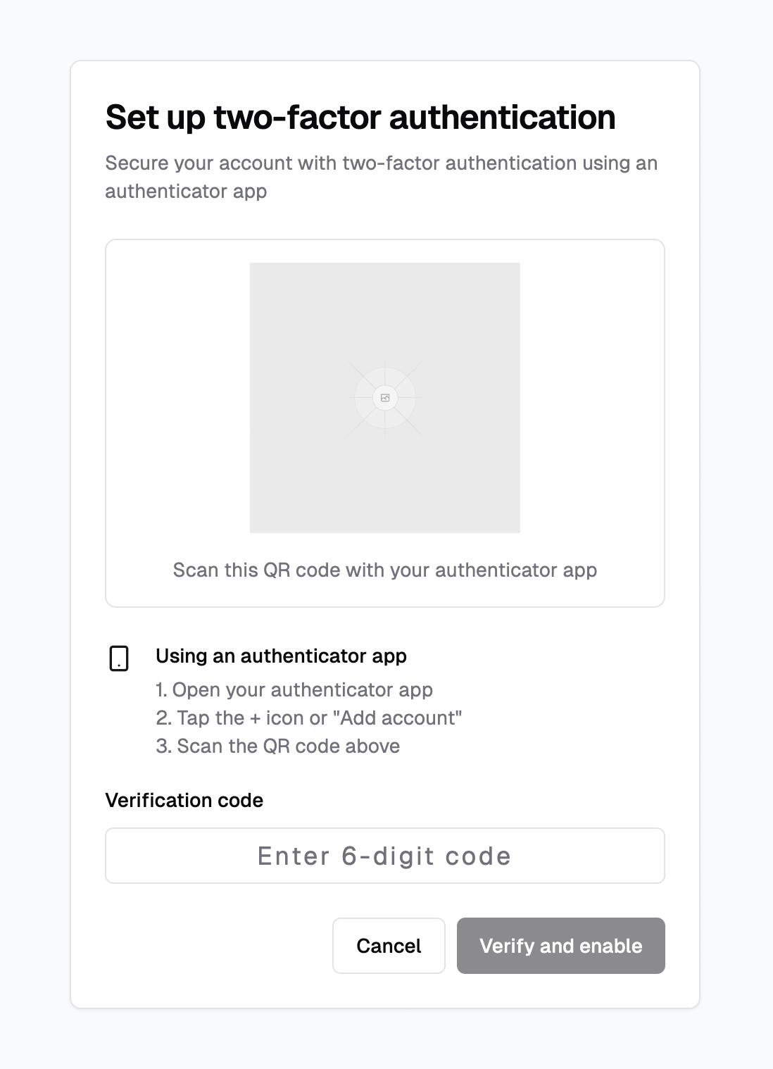 - Prompt: Create a page for enabling two factor authentication with TOTP that displays a QR code and an input for testing passcode generated with user's authenticator app. I'm using React and Semantic UI. Do not use supabase or any PaaS, just for static UI for mocking.