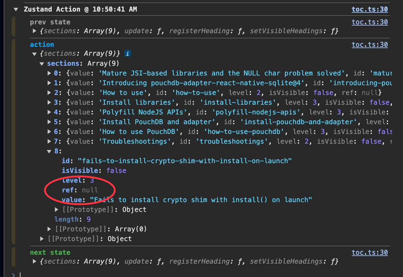 So, it re-renders MarkdownView twice, wihch causes the ref values to be null.