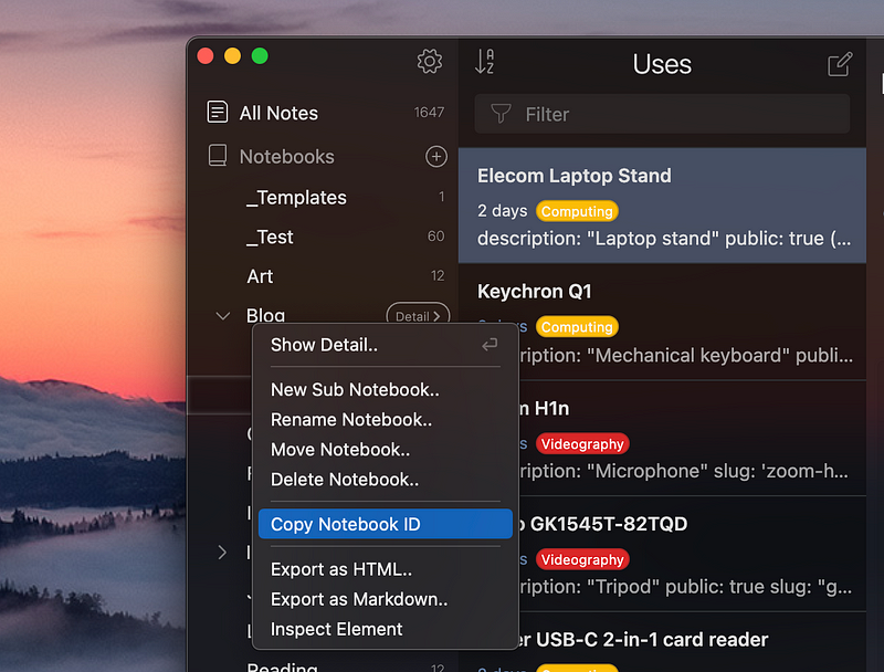 INKDROP_BOOKID='<BOOKID>'Here, you need an ID of the notebook that you want to export. To get the notebook ID easily, install the dev-tools plugin from Preferences → Plugins/Install.