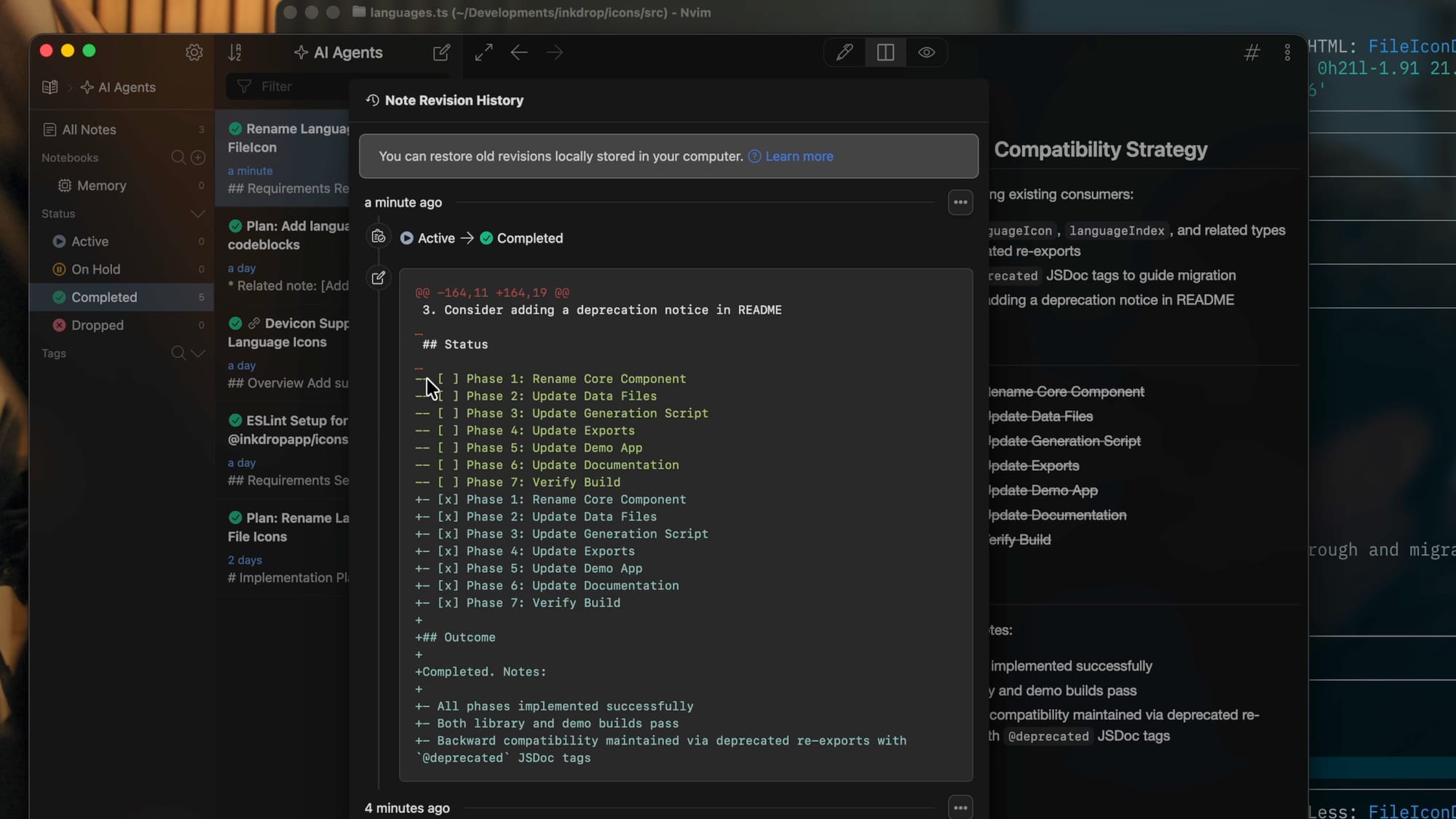 - Saved to Inkdrop - The plan is automatically saved as a note with status