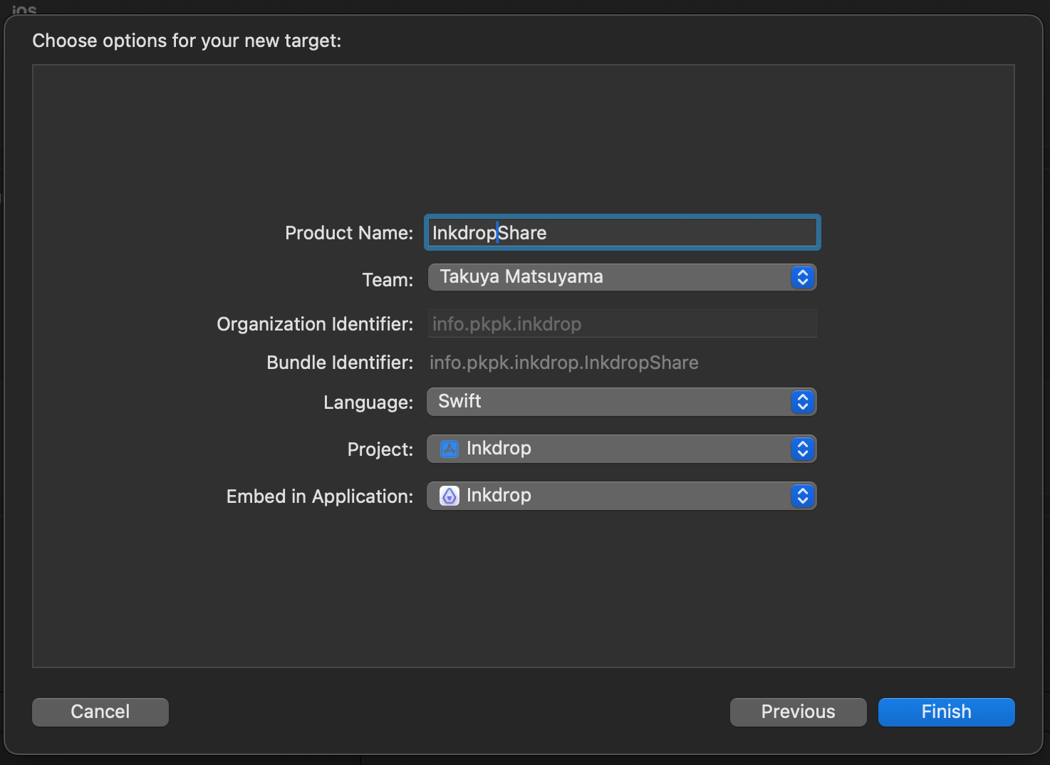 In Xcode, go to File → New → Target..., then choose “Share Extension”. Give it a descriptive name (for example, "InkdropShare")—this name will appear in the share sheet.